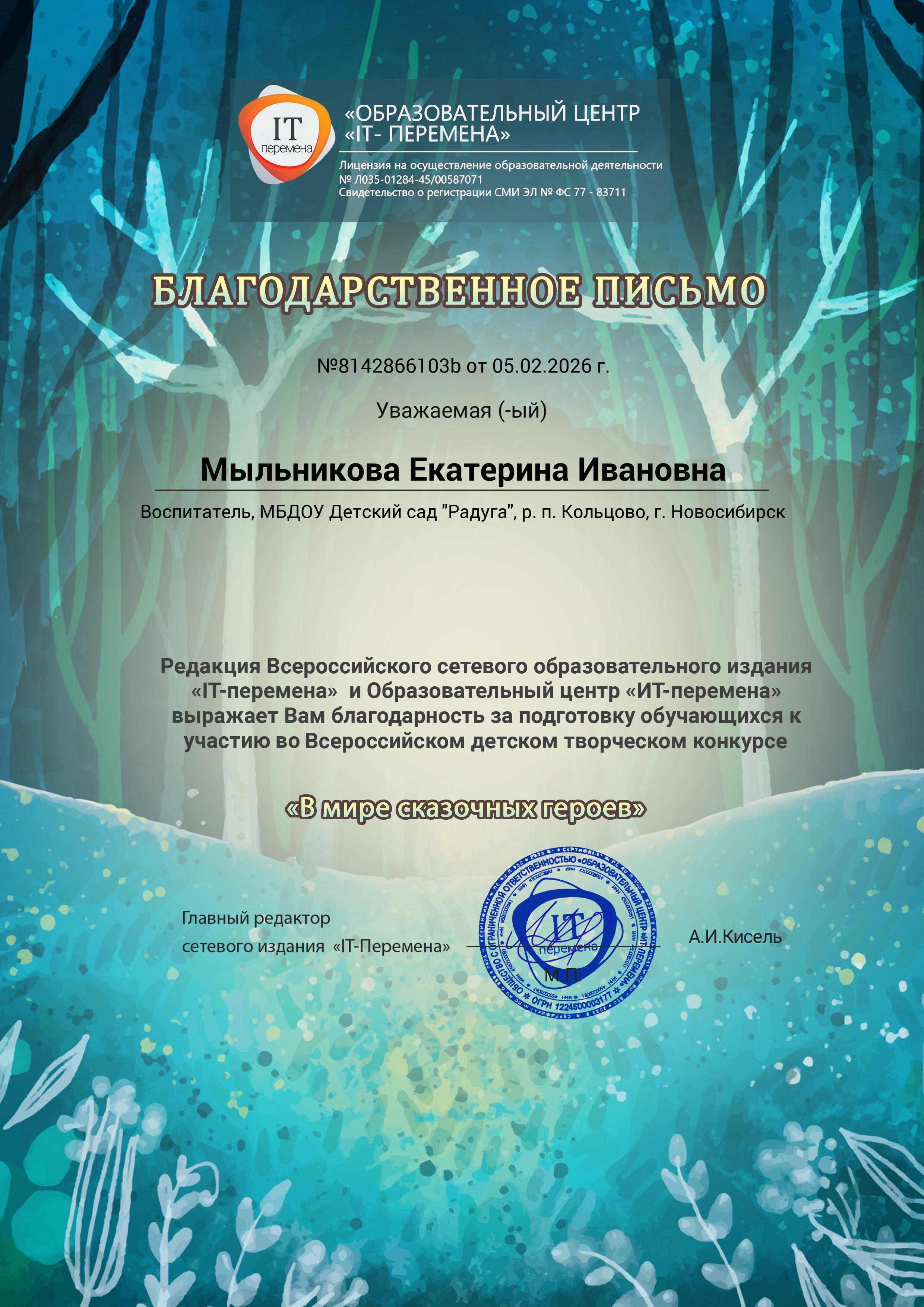 Благодарственное письмо за подготовку обучающихся к участию во Всероссийском детском творческом онлайн- конкурсе * В мире сказочных героев* в Образовательном центре IT-ПЕРЕМЕНА.