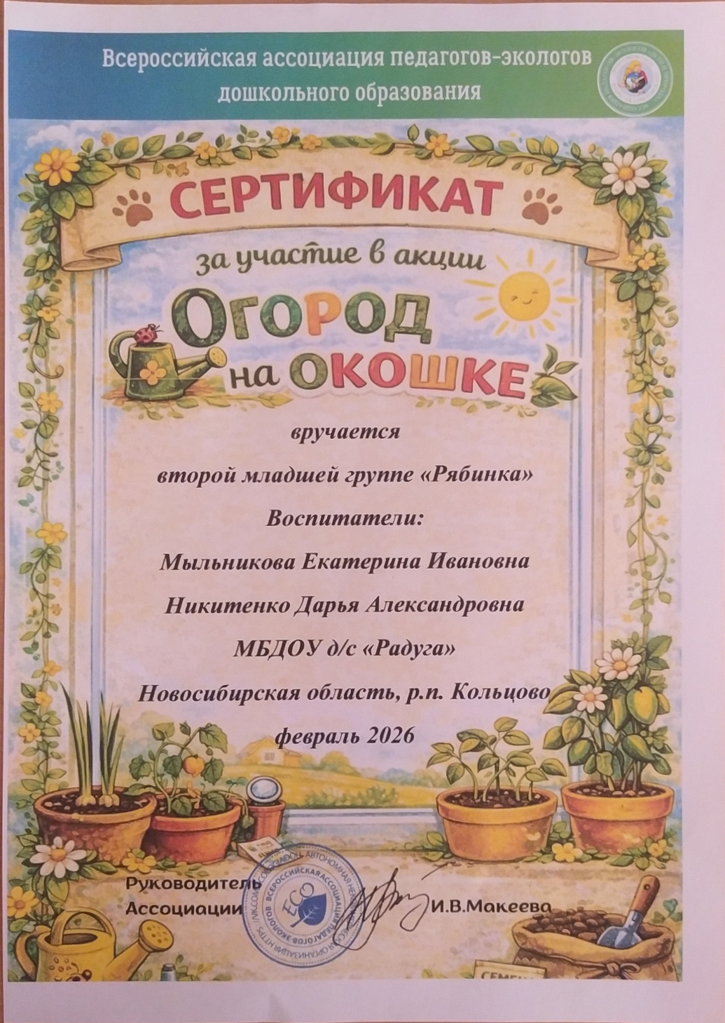 Сертификат за участие в акции-Огород на окошке- во Всероссийской ассоциации педагогов экологов дошкольного образования.