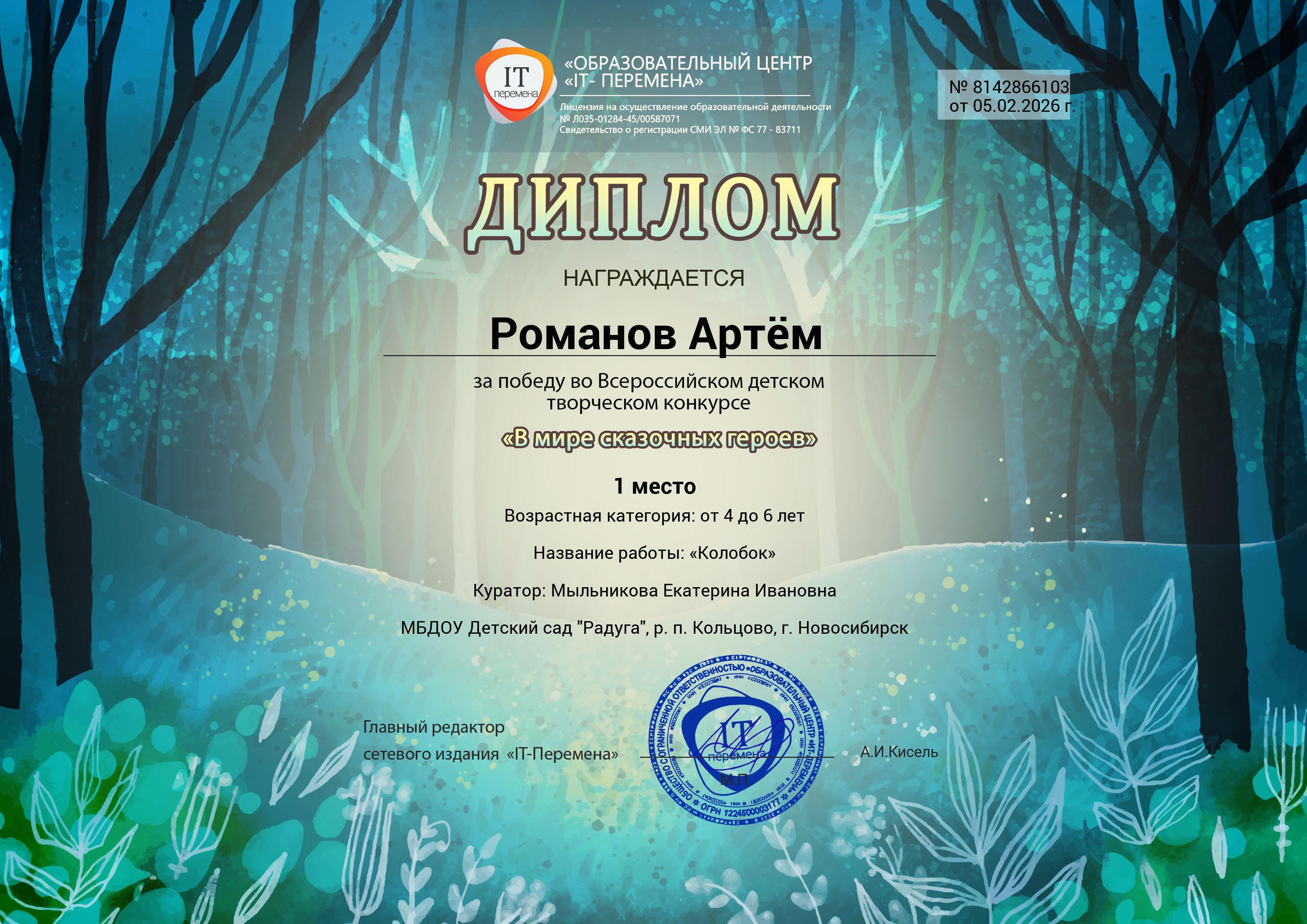 Диплом за победу 1 место во Всероссийском детском, творческом конкурсе *В мире сказочных героев* Романову Артему в Образовательном центре IT-ПЕРЕМЕНА .
