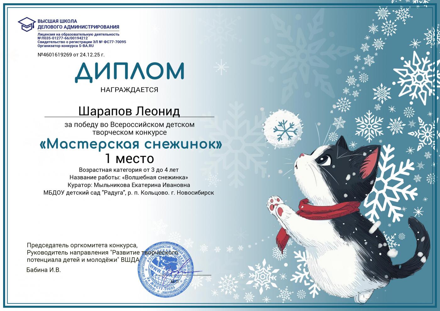 Диплом за победу 1 место во Всероссийском детском, творческом конкурсе *Мастерская снежинок* Шарапова Леонида в Высшей школе делового администрирования