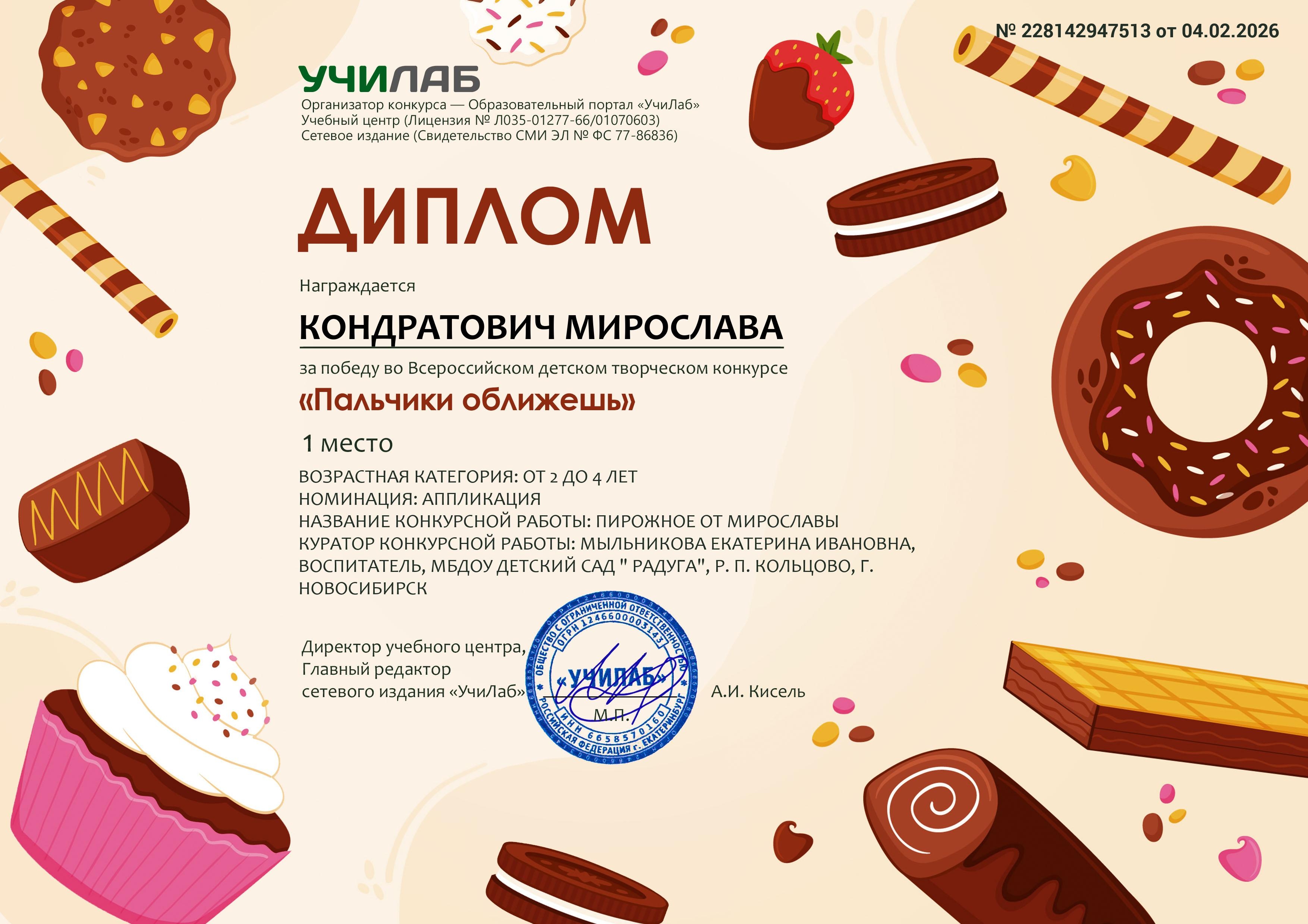 Диплом за победу 1 место во Всероссийском детском, творческом конкурсе *Пальчики оближешь * Кондратович Мирослава в Образовательном портале УЧИЛАБ.