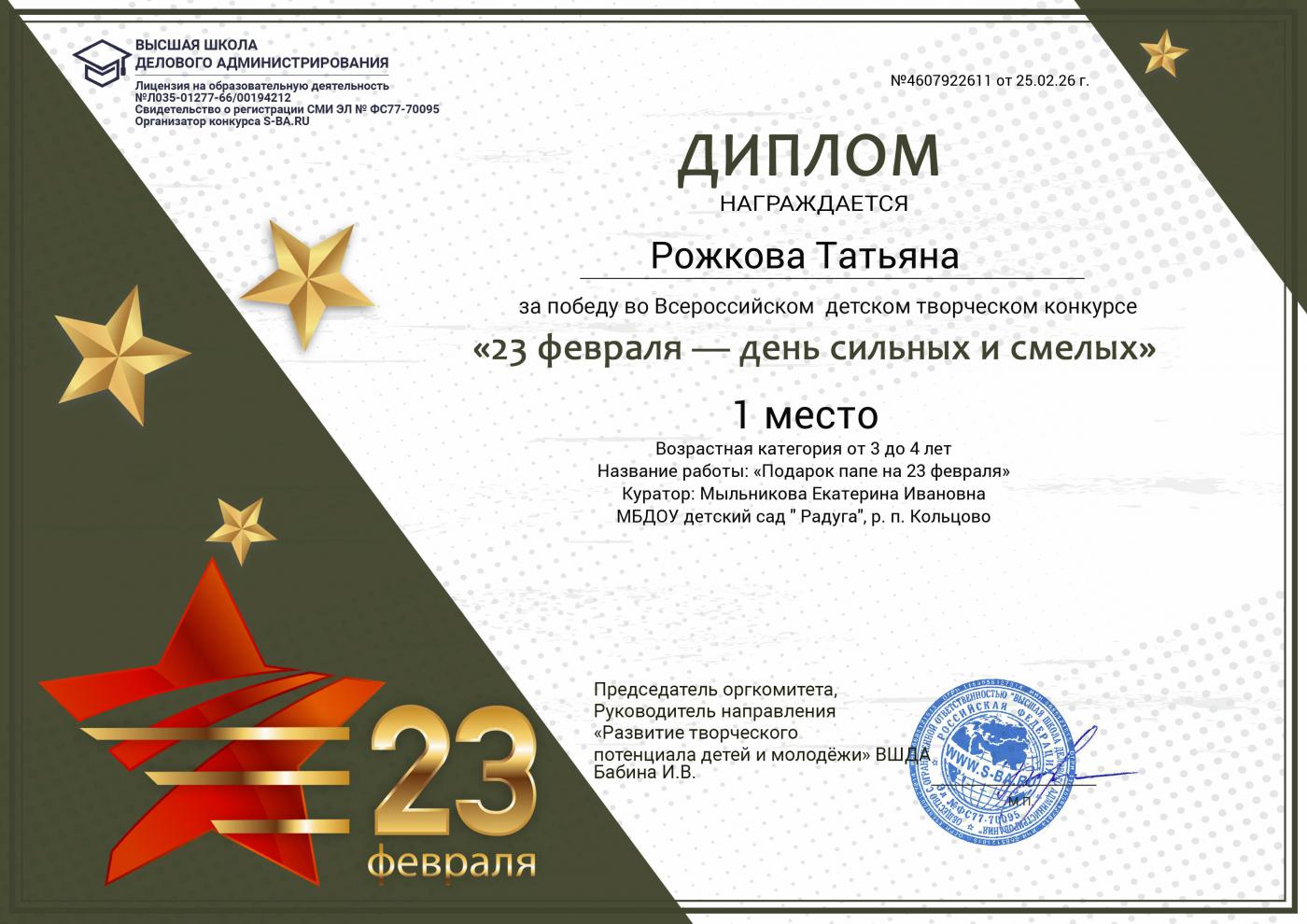 Диплом за победу 1 место во Всероссийском детском, творческом конкурсе *23 ФЕВРАЛЯ -ДЕНЬ СИЛЬНЫХ И СМЕЛЫХ* Рожковой Татьяне в Высшей школе делового администрирования