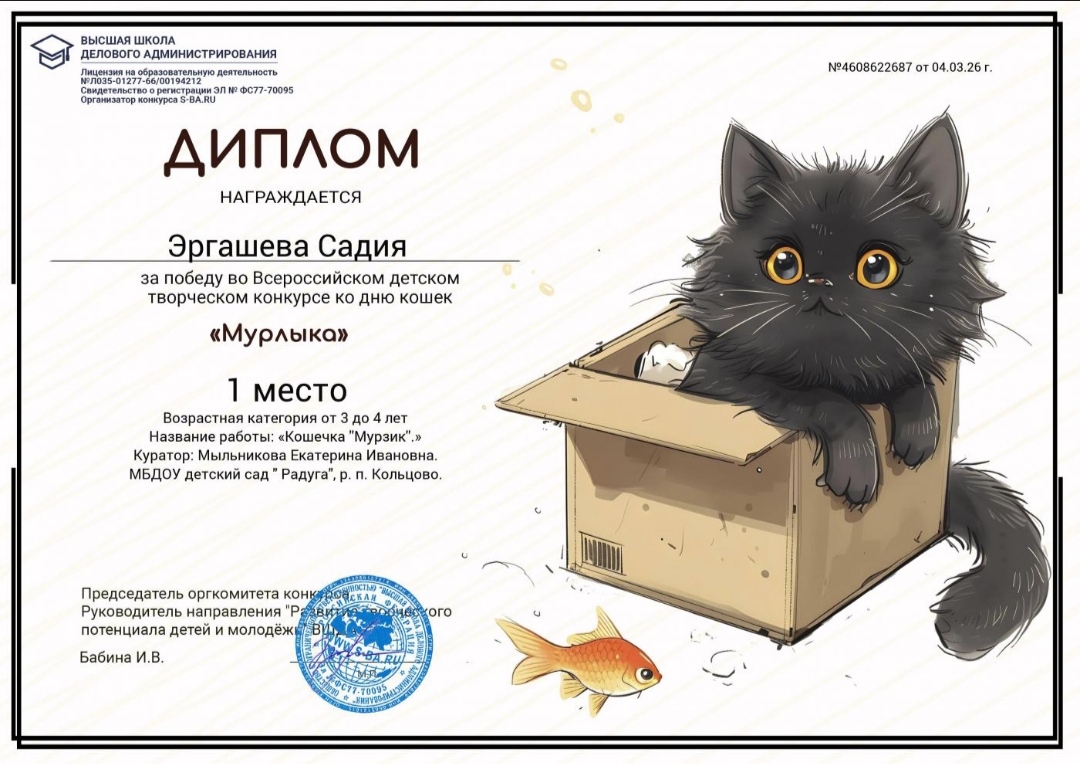 Диплом за победу 1 место во Всероссийском детском, творческом конкурсе ко дню кошек *Мурлыка*Эргашевой Садии в Высшей школе делового администрирования