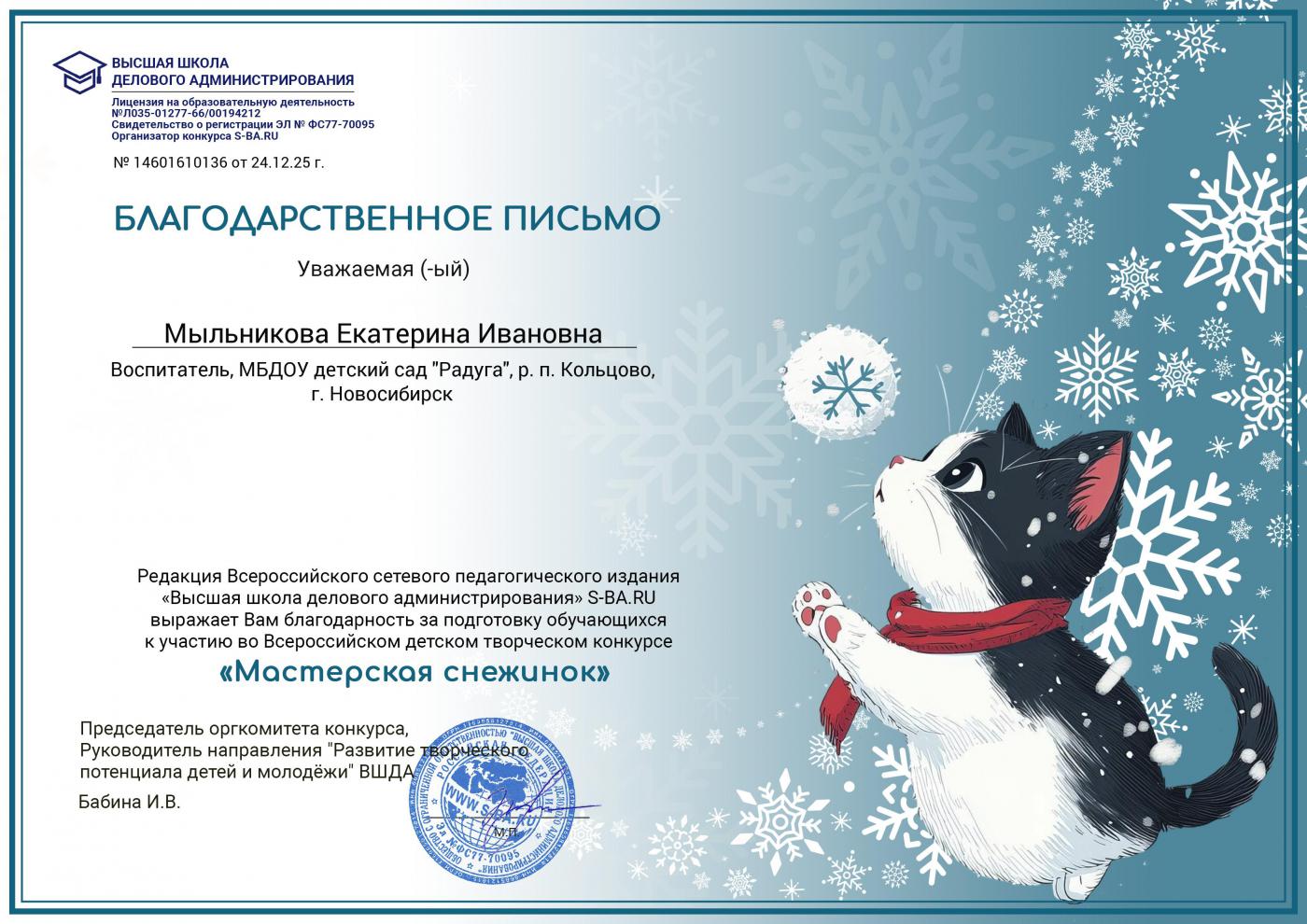 Благодарственное письмо за подготовку обучающихся к участию во Всероссийском детском творческом онлайн- конкурсе * Мастерская снежинок* в Высшей школе делового администрирования.
