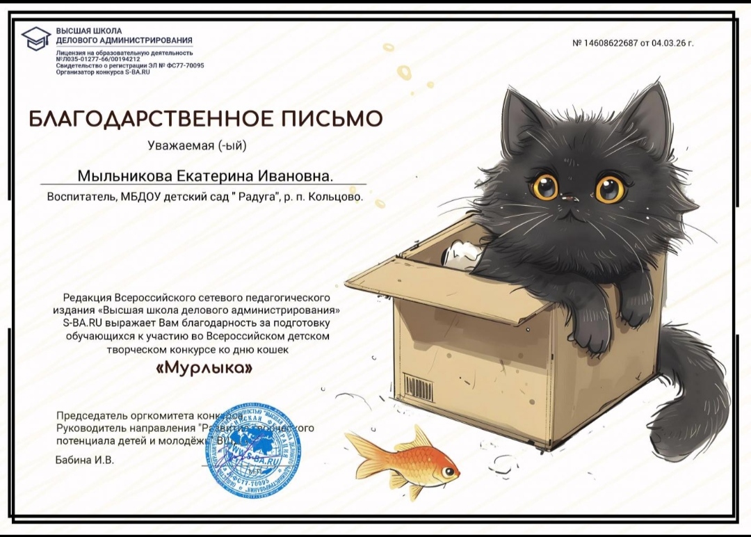 Благодарственное письмо за подготовку обучающихся к участию во Всероссийском детском творческом онлайн- конкурсе * Мурлыка* в Высшей школе делового администрирования.