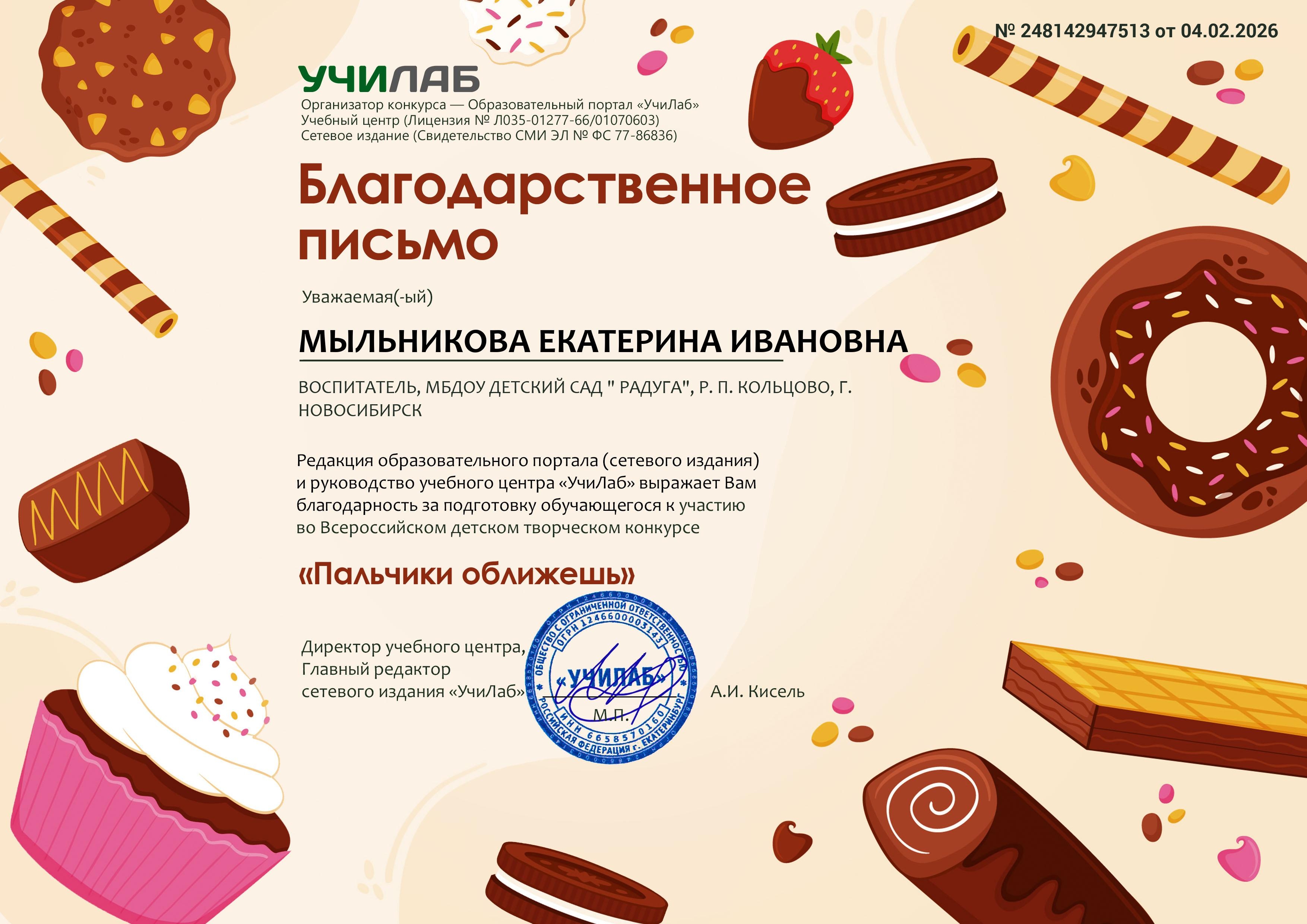 Благодарственное письмо за подготовку обучающихся к участию во Всероссийском детском творческом онлайн- конкурсе * Пальчики оближешь* в Образовательном портале УЧИЛАБ.