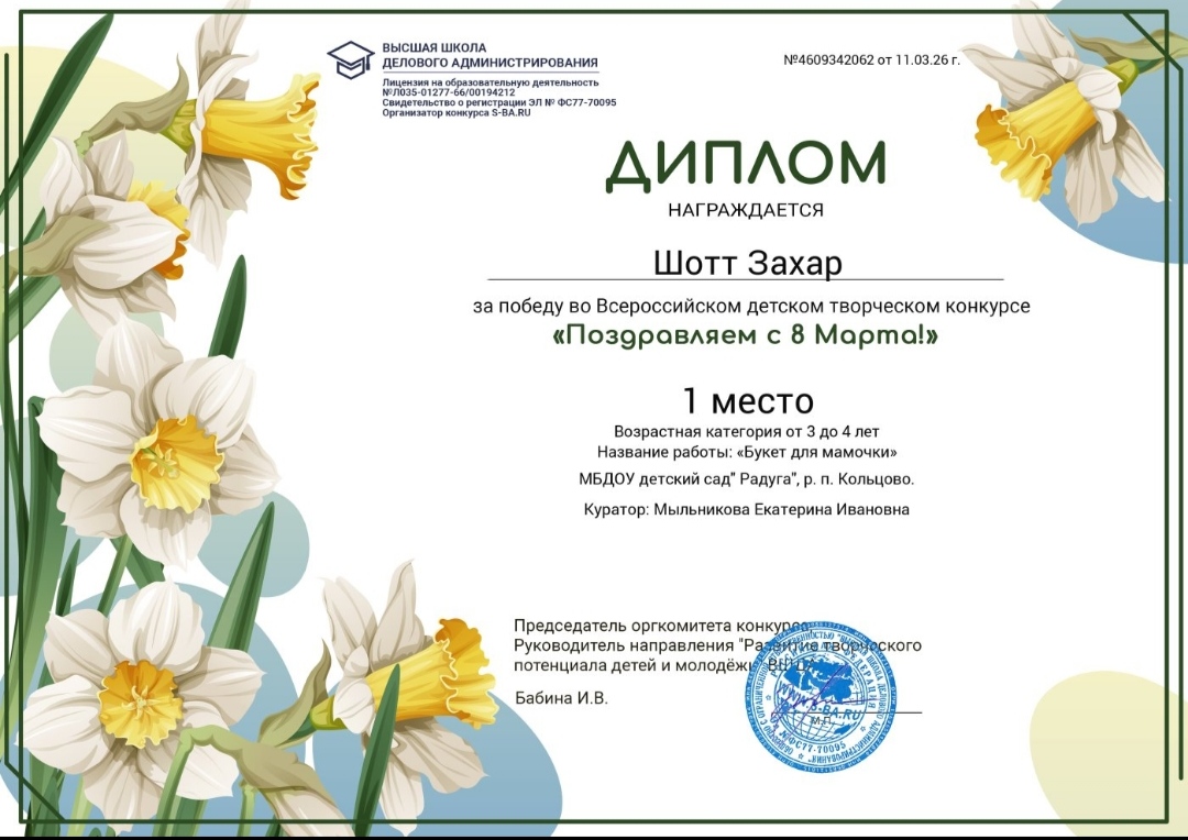 Диплом за победу 1 место во Всероссийском детском, творческом конкурсе *Поздравление с 8 марта* Шотт Захара в Высшей школе делового администрирования