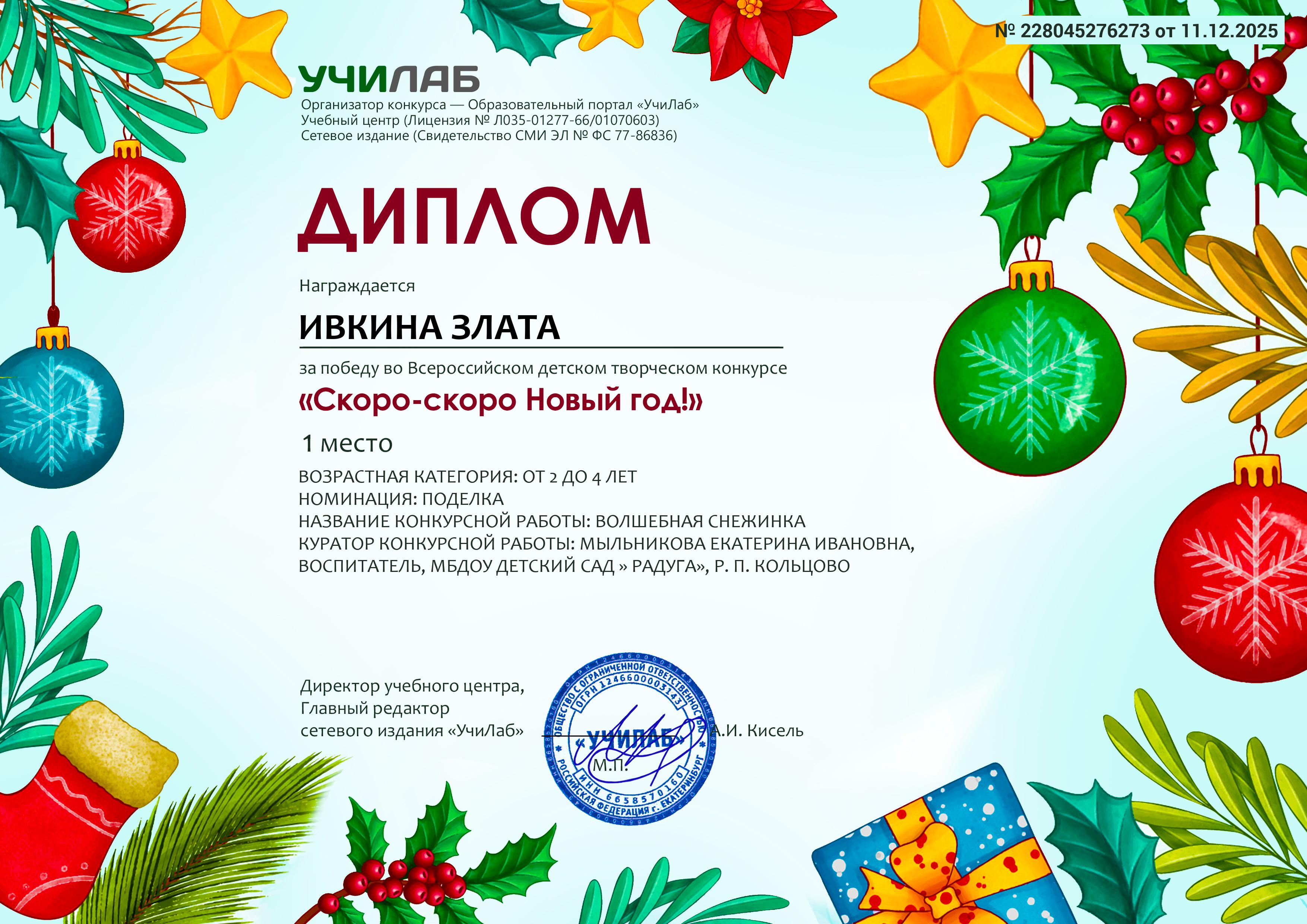 ДИплом за победу во Всероссийском детском творческом конкурсе на Образовательном портале УЧИЛАБ *Скоро-скоро Новый год*1 место Ивкиной Златы