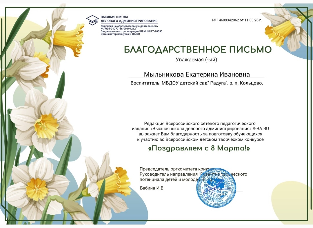 Благодарственное письмо за подготовку обучающихся к участию во Всероссийском детском творческом онлайн- конкурсе * Поздравление с 8 марта* в Высшей школе делового администрирования