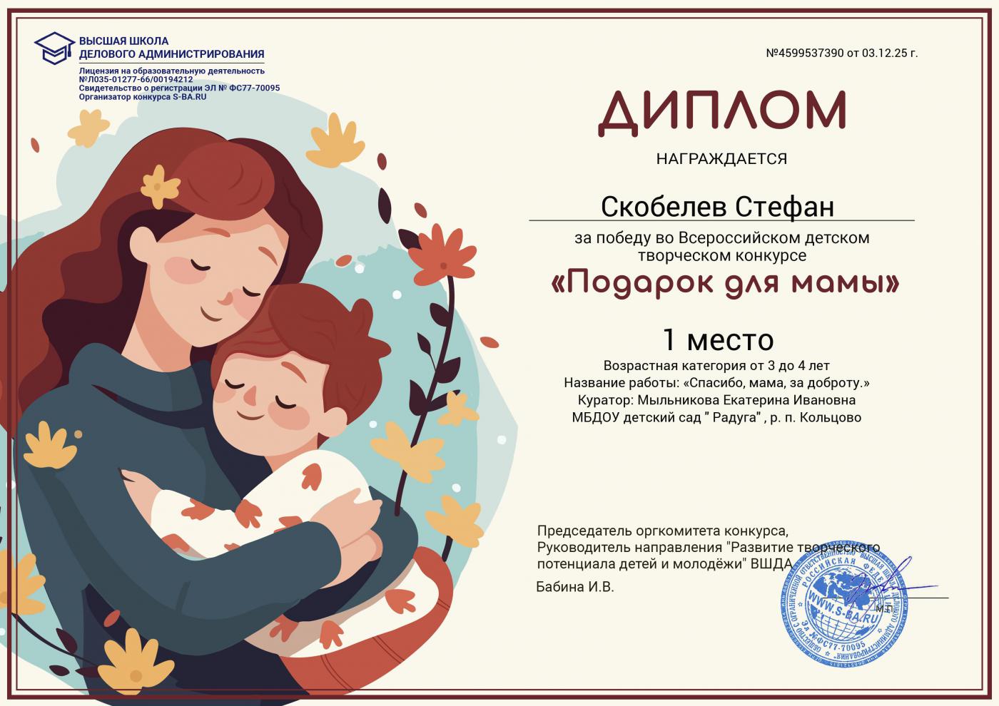 Диплом за победу 1 место во Всероссийском детском, творческом конкурсе *Подарок для мамы* Скобелева Стефана в Высшей школе делового администрирования