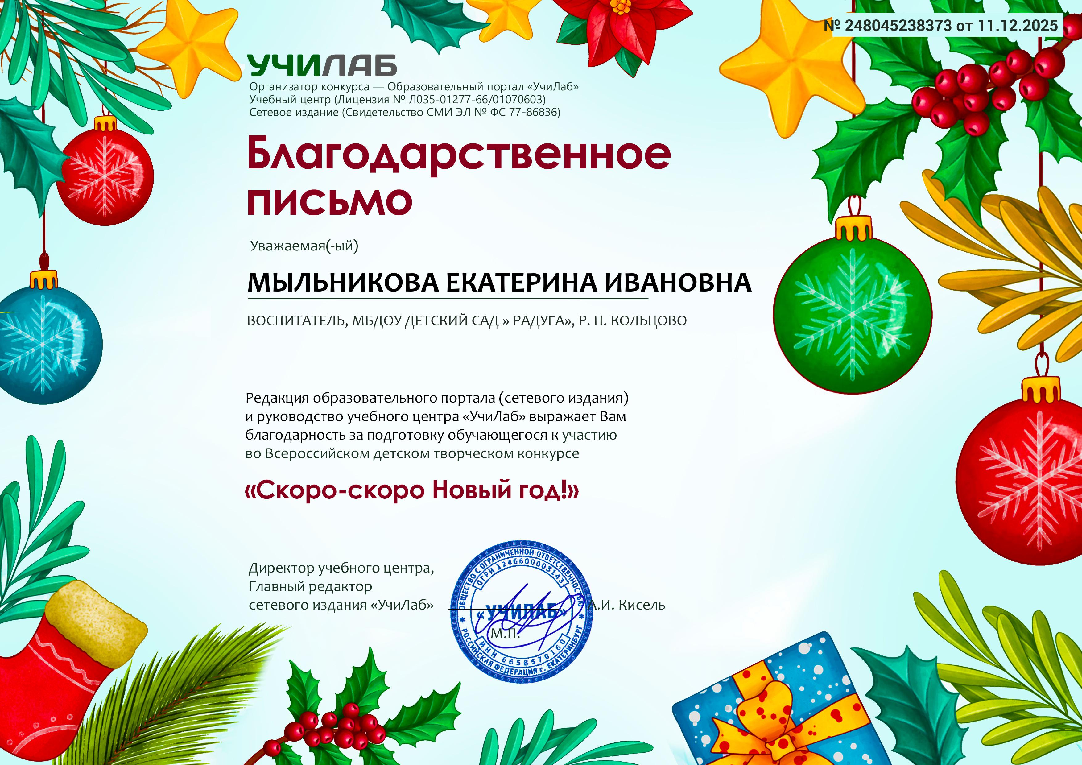 Благодарственное письмо за подготовку обучающихся к участию во Всероссийском детском творческом онлайн- конкурсе * Скоро-скоро Новый год* в Образовательном портале УЧИЛАБ